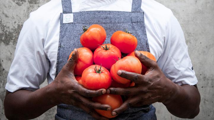 Tomatsalsa med bagte søde kartofler, forårsløg, ærter, spinat og karse (1,7,8,10,11,13,15). VE LF