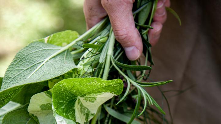 Oksekød marineret i ahornsirup og chili. Dertil pasta, bagte rodfrugter, spinat, ærter,