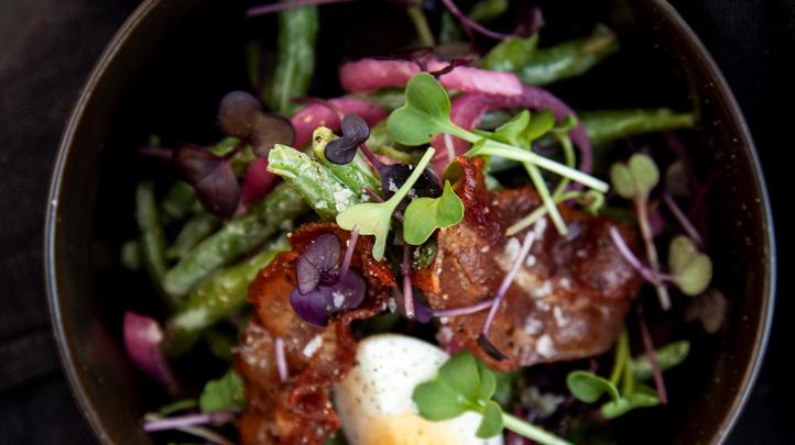 Krydret falafel med urtepesto, syltede rødløg og spidskål (1,7,8,10,11,13,15). VE LF