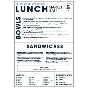I Torvets Frokostbod er der noget for enhver smag og alle retter er portionsanrettet. Du vælger selv, fra dag til dag, hvordan du ønsker at sammensætte dagens frokost og kan frit skifte mellem kolde måltider, bowls, smørrebrød og sandwiches. Om torsdagen medfølger ugens kage, så der hver uge er lidt til den søde tand.