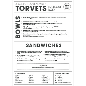 Udvalget i Torvets Frokostbod fornyes i løbet hen over året, men er du nysgerrig på, hvad vi tilbyder netop nu, kan du blive klogere her på siden.