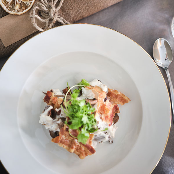 Med svampe, asparges og timian, hertil hjemmelavet kalkun bacon.