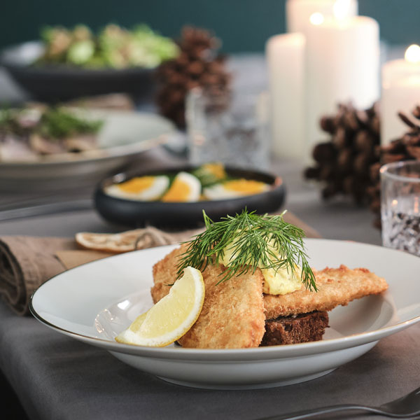 Vendt med citronskal og friskhakket dild. Hertil krydderurtemayonnaise.