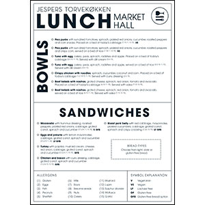 I Torvets Frokostbod er der noget for enhver smag og alle retter er portionsanrettet. Du vælger selv, fra dag til dag, hvordan du ønsker at sammensætte dagens frokost og kan frit skifte mellem kolde måltider, bowls, smørrebrød og sandwiches. Om torsdagen medfølger ugens kage, så der hver uge er lidt til den søde tand.