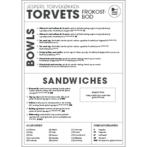 Udvalget i Torvets Frokostbod fornyes i løbet hen over året, men er du nysgerrig på, hvad vi tilbyder netop nu, kan du blive klogere her på siden.